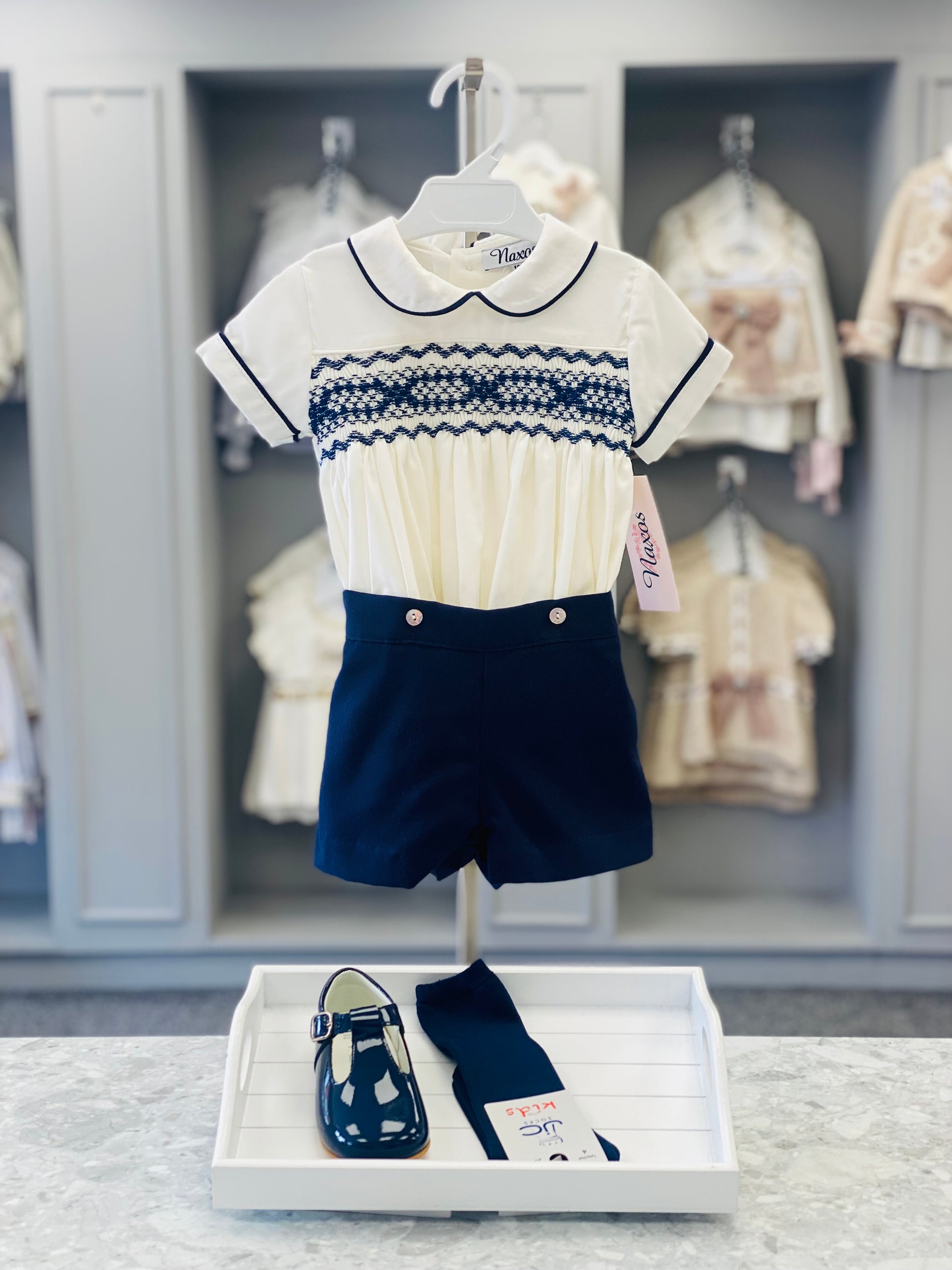 AW25 NAXOS Navy Boys Hand Smocked Short Set.
